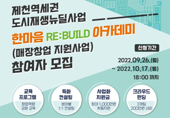[제천=뉴시스] 이병찬 기자 = 충북 제천역세권 도시재생현장지원센터는 창업 지원 프로그램 '한마음리빌드아카데미'를 운영한다고 28일 밝혔다.