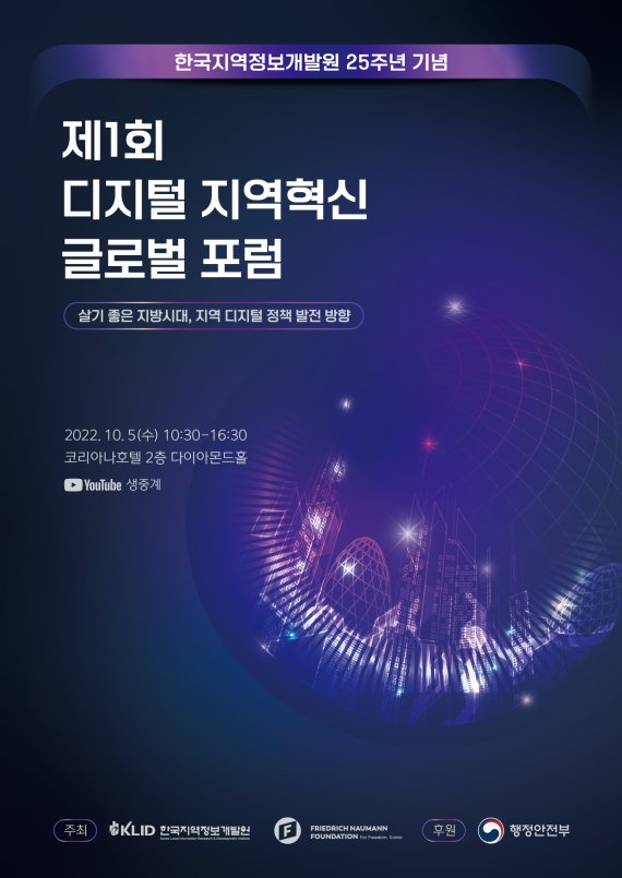 [서울=뉴시스] 오제일 기자 = 행정안전부 산하 한국지역정보개발원이 창립 25주년을 맞아 오는 10월5일 '제1회 디지털 지역혁신 글로벌 포럼'을 개최한다고 29일 밝혔다.