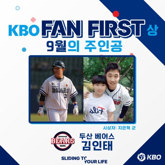 한국야구위원회(KBO)는 4일 "리그 선수와의 특별했던 팬 서비스 경험 및 사연을 접수 받아 진행되는 KBO 팬 퍼스트상의 9월 수상자로 김인태가 선정됐다"고 발표했다.