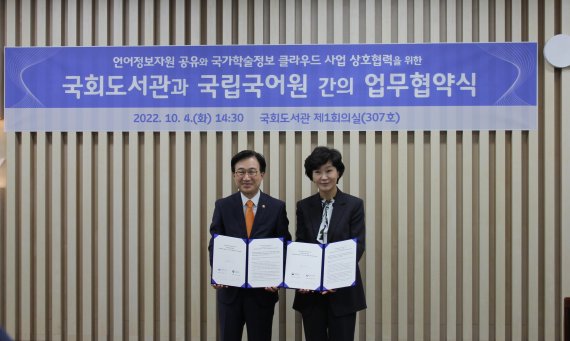 [서울=뉴시스]신재우 기자 = 국립국어원은 4일 국회도서관과 언어 정보 자원 공유 및 국가학술정보 클라우드 사업을 위한 업무 협약을 진행했다고 밝혔다.