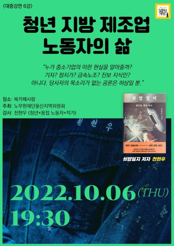 (울산=뉴스1) 조민주 기자 = 노무현재단 울산지역위원회는 6일 오후 7시30분 울산 남구 신정동 북카페 사람에서 '쇳밥일지' 저자 천현우씨(32) 초청 강연을 개최한다고 밝혔다.