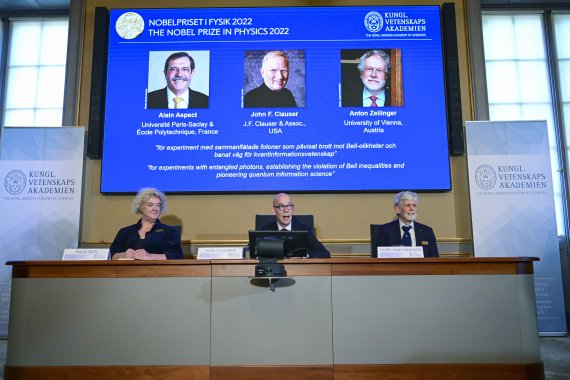 [스톡홀름(스웨덴)=AP/뉴시스]스웨덴 왕립과학원의 한스 엘레그렌 사무총장(가운데)과 노벨 물리학위원회의 에바 올슨(왼쪽), 토르스 한스 핸슨 위원이 4일 스톡홀름에서 2022년 노벨 물리학상 수상자를 발표하고 있다. 이들의 머리 위 화면에 알랭 아스펙트(프랑스), 존 클로저(미), 안톤 자일링거(오스트리아, 왼쪽부터) 등 공동수상자 3명의 사진이 보인다. 2022.10.4 [스톡홀름(스웨덴)=AP/뉴시스]유세진 기자 = 2022년 노벨 물리학상은 양자 역학 분야를 연구한 프랑스의 알랭 아스펙트, 미국의 존 클로저, 오스트리아의 안톤 자일링거 등 3명이 공동 수상했다고 스웨덴 왕립과학원 노벨위원회가 4일 발표했다.