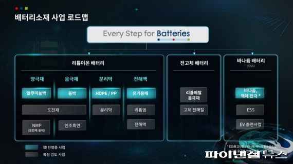 롯데그룹은 화학군 내 회사들을 통해 다양한 전지소재사업에 적극 투자하고 있다. 롯데케미칼, 롯데정밀화학, 롯데알미늄과 함께 배터리 4대 소재(양극재, 음극재, 전해액, 분리막)에 직간접적으로 투자·생산을 진행하고 있다. 이와 관련 △롯데케미칼은 분리막(PE) 생산 및 배터리 전해액 유기용매(EC, DMC) 공장을 건설 중이며 △롯데알미늄과 롯데정밀화학은 각각 양극박, 동박(솔루스첨단소재 지분투자) 사업을 진행중에 있다.