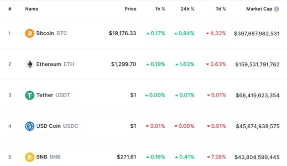 비트코인은 13일 오전 6시 30분 현재(한국시간 기준) 글로벌 코인시황 중계사이트인 코인마켓캡에서 24시간 전보다 0.84% 상승한 1만9176달러를 기록하고 있다.