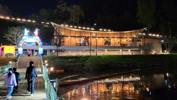 (진주=뉴스1) 한송학 기자 = 경남 진주 남강변에 건립된 '물빛나루쉼터'가 지역의 랜드마크로 급부상하고 있다. 이 쉼터는 지난 10일부터 개최 중인 진주남강유등축제와 맞물려 새로운 볼거리를 제공하면서 입소문을 타고 있다.