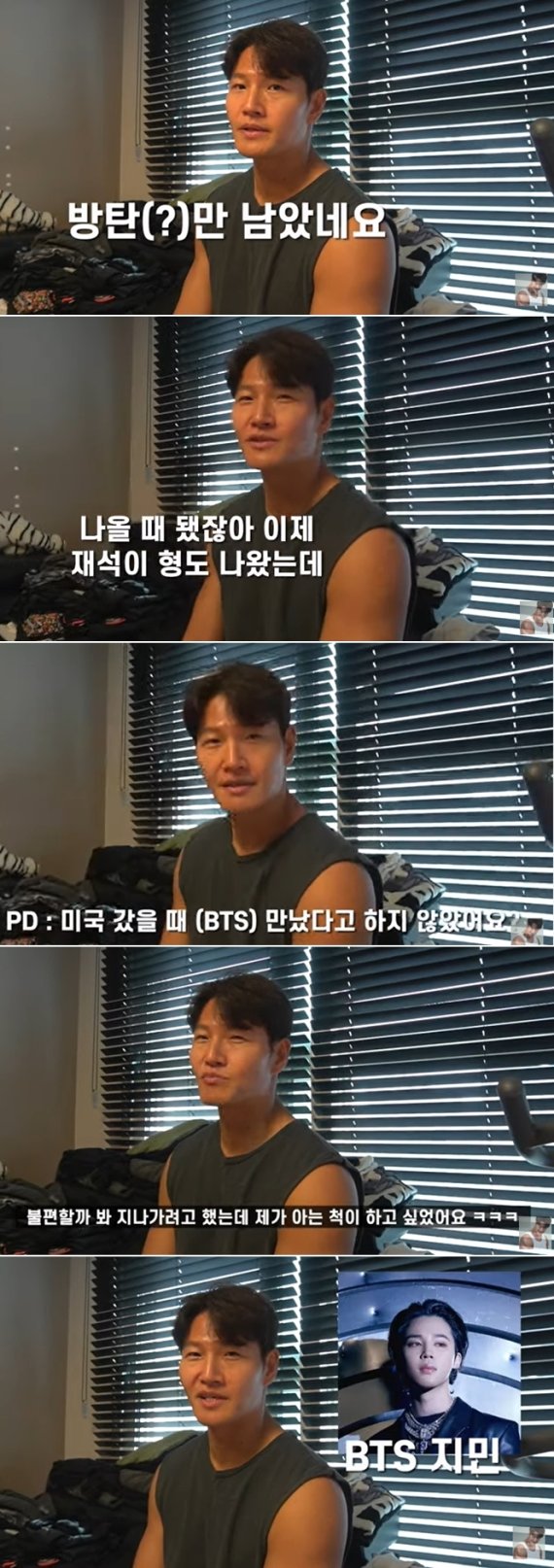 김종국은 "미국 갔을 때 BTS 만났다고 하지 않았냐"는 제작진의 물음에 "LA 로데오 길거리에서 (지민이) 밥을 먹고 있었다"며 "사실 난 모르고 지나갔는데 매니저가 알려줬다"고 밝혔다.