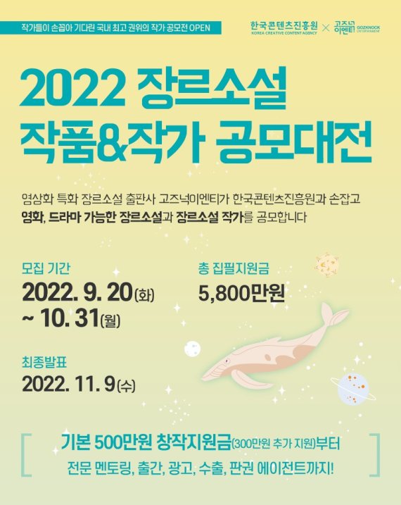 [서울=뉴시스]신재우 기자 = 장르소설 출판사 고즈넉이엔티가 한국콘텐츠진흥원과 함께 '2022 장르소설 작품&작가 공모대전'을 개최한다고 14일 밝혔다.