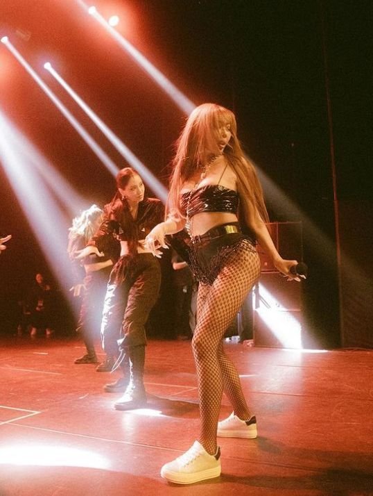 사진 속 제시는 무대 위에서 파격적인 망사 의상으로 섹시하면서도 카리스마 있는 모습을 보이고 있다.