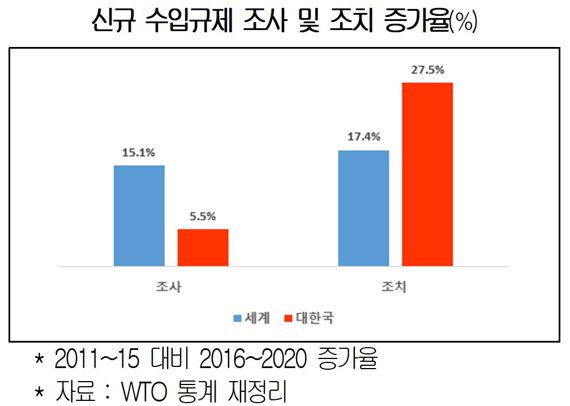 반면 같은 기간 한국을 대상으로 한 수입규제 조사는 103건에서 109건으로 5.8% 늘어났지만, 시행 조치 건수는 58건에서 80건으로 37.9%나 급증했다. 조사개시 건수는 전세계보다 약 10% 적지만, 실제 조치로 이어진 건수는 16% 가량 많아 국내 기업의 수입규제 대응 능력이 다른 나라에 비해 떨어지는 것이 원인으로 풀이된다.