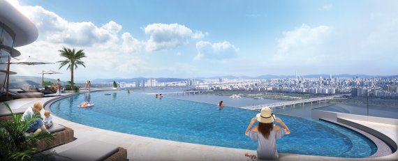 '한남써밋'의 6개 주동을 잇는 총 연장 360m의 초대형 스카이 커뮤니티 '인피니티 스카이 브릿지'는 물결을 형상화해 한강과 남산, 용산공원을 한눈에 조망할 수 있도록 설계됐다. 야외 수영장 '인피니티 풀'(사진)은 싱가포르 마리나 베이 샌즈 호텔의 상징을 옮겨와 한강과 연결된 듯한 환상적인 공간과 감상을 연출한다. 스카이 클럽하우스, 스카이 시네마(영화관), 스카이 북카페, 게스트하우스 등 고급 커뮤니티 시설 역시 단지 최상층인 21층에 배치해 특별함을 더했다.