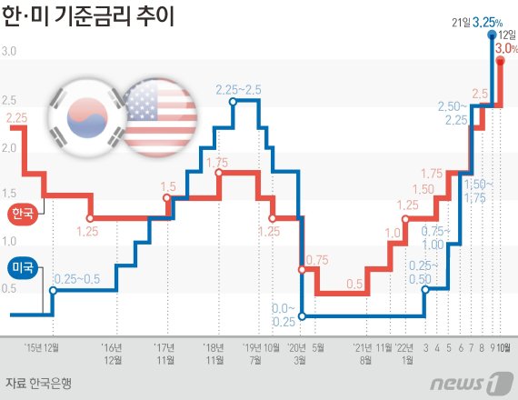 이미 한미 금리는 역전됐다. 현재 미국의 기준금리는 3.0%~3.25% 수준이다. 한국의 기준금리는 3.0%다.
