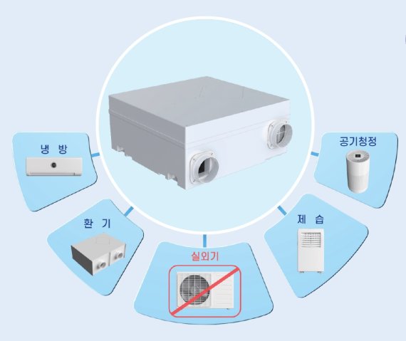 실내환경에 따라 자동으로 회전수 제어가 되는 컴프레서, 순간 작동하는 배기휀, 고효율 전열교환소자 등을 적용해 일반 에어컨의 실외기·실내기·공기정화기를 하나의 장비로 합칠 수 있었다.
