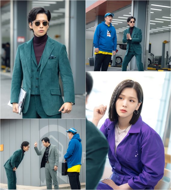 반면 천지훈과 함께 위장 잠입한 백마리 복장 역시 흥미롭다. 백마리는 평소의 컬러풀 정장스타일을 잠시 내려놓고 중고차 새내기 딜러로 분한다. 보라색 점프 수트와 블링블링한 블레이즈 헤어가 눈길을 끄는 가운데 당찬 활약을 펼칠 백마리의 행보도 기대된다.