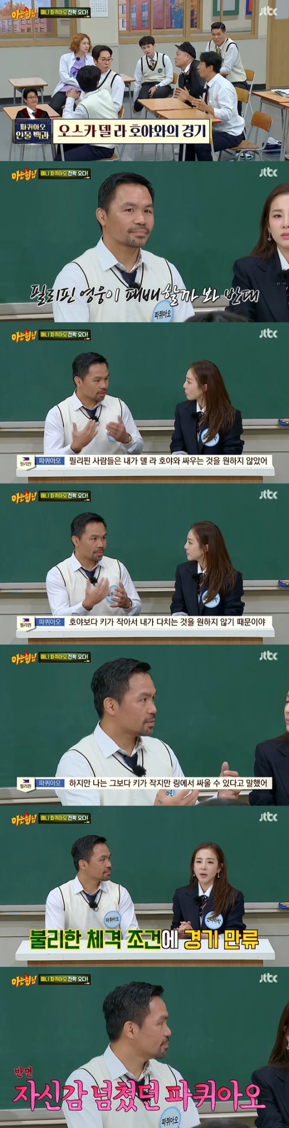 매니 파퀴아오는 22일 방송된 JTBC '아는형님'에서 "필리핀 사람들은 내가 델 라 호야와 싸우는 걸 원하지 않았다"며 "내가 호야보다 키가 작아서 다치는 것을 원하지 않았다"고 말했다.