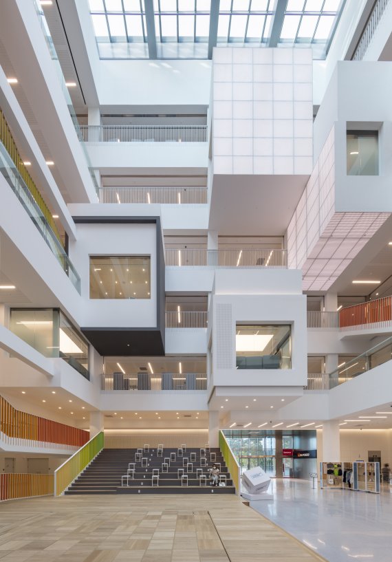 미래에 대한 상상력을 현실로 구현하겠다는 의도를 담아 '플로팅' 개념을 적용해 떠 있는 우주선 모양의 독특한 외관으로 설계했으며, 건물 내부에는 로비 층부터 최상 층까지 막힘없이 수직으로 뚫려있는 아트리움과 공중에 부양하듯이 설치된 상자 모양의 플로팅 큐브 회의실 등의 공간을 조성했다.