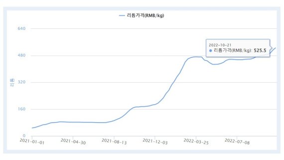 24일 한국광해광업공단 한국자원정보서비스에 따르면 탄산리튬 가격은 톤당 52만5500위안(1억368만원)이다. 리튬 가격이 톤당 50만위안을 넘은 것은 관련 통계가 시작된 2012년 이후 처음이다.