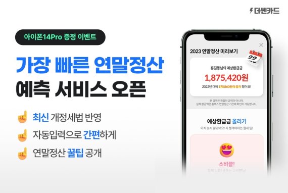이현철 헥토이노베이션 대표는 "연말정산이 익숙지 않은 납세자나 현금과 카드 사용 비율을 최적화하기를 원하는 현명한 소비자를 위해 연말정산 예측 서비스를 추가했다"며 "더쎈카드로 연말정산 예상 환급금을 확인하고 환급금을 최대화할 수 있는 가이드를 통해 '13월의 보너스'를 챙기시기를 바란다"고 말했다.