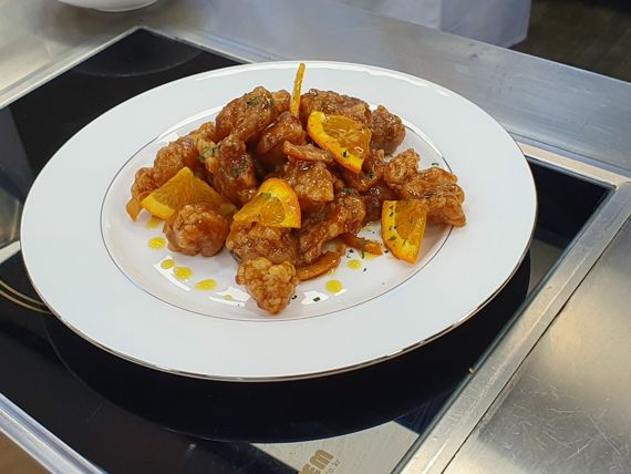 만다린 오렌지 치킨은 중식 메뉴라기보다는 미국에서 생겨난 정통 아메리칸 차이니즈 요리다. 쿠킹쇼 진행을 맡은 이정희 롯데마트 푸드이노베이션센터(FIC) 팀장은 "소스에 천연 오렌지 제스트 등 원물이 들어갔다"며 "손님 초대 메뉴로 좋고 맥주, 와인, 밥과 잘 어울린다"고 소개했다.