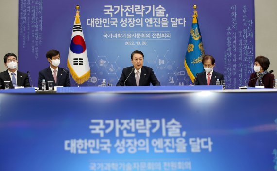 [서울=뉴시스] 홍효식 기자 = 윤석열 대통령이 28일 서울 용산 대통령실 청사에서 열린 국가과학기술 자문회의 제1회 전원회의를 주재하고 있다. 2022.10.28. yesphoto@newsis.com [서울=뉴시스] 홍효식 기자 = 윤석열 대통령이 28일 용산 대통령실에서 국가과학기술 자문회의 제1회 전원회의를 주재했다.