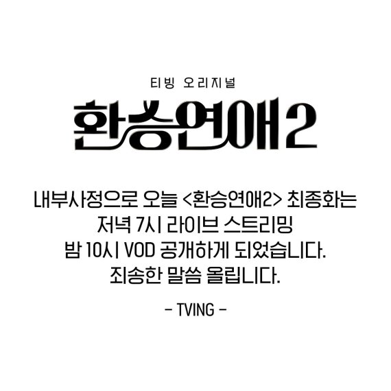 티빙은 28일 오후 2시25분께 인스타그램, 페이스북 등 사회관계망서비스(SNS) 채널을 통해 "내부사정으로 오늘 '환승연애2' 최종화는 저녁 7시 라이브 스트리밍, 밤 10시 VOD 공개하게 됐습니다. 죄송한 말씀 올립니다"라고 공지했다.