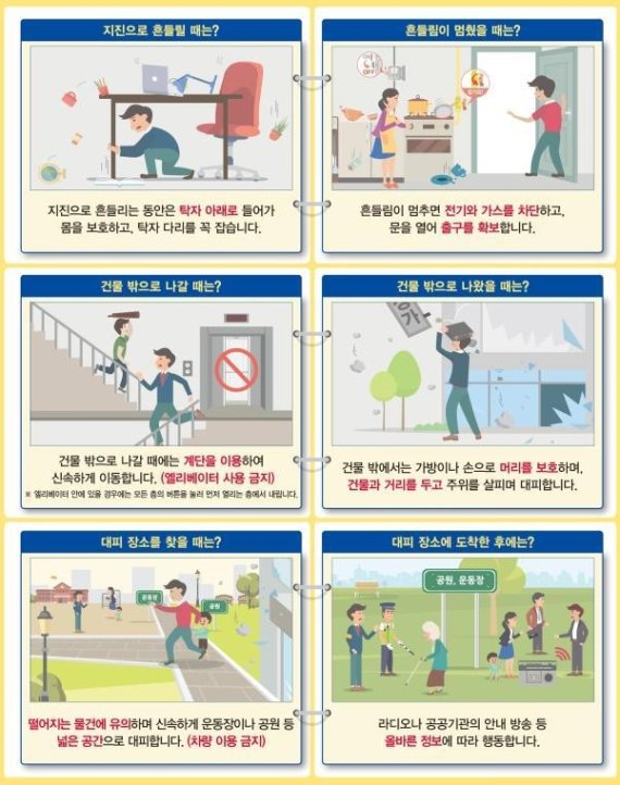 흔들림이 멈춘 뒤나 대피 후의 행동 요령도 잘 살펴야 한다.