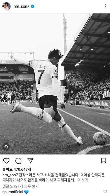 본머스와의 2022-23 EPL 14라운드 원정 경기(3-2 승리)서 풀타임을 소화한 손흥민은 경기 후 자신의 SNS를 통해 "갑작스러운 사고 소식을 전해 들었습니다. 더 이상 안타까운 피해자가 나오지 않기를 바라며 사고 피해자들에게 깊은 애도를 표합니다"는 글을 올렸다.