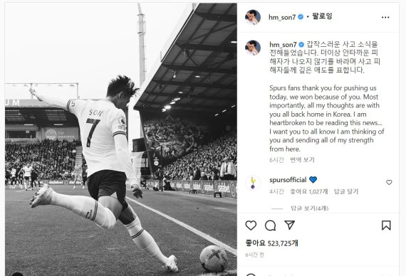 손흥민은 30일 인스타그램에 흑백 경기 사진을 올리고 "갑작스러운 사고 소식을 전해들었다"며 "더 이상 안타까운 피해자가 나오지 않기를 바라며 사고 피해자들께 깊은 애도를 표한다"고 밝혔다.