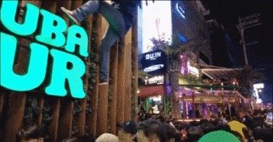 30일 각종 온라인 커뮤니티에는 사고 현장 인근의 한 가게 벽을 기어올라 간판을 밟고 이동하는 외국인을 찍은 영상이 속속 올라왔다. 영상 속의 인물은 엄청난 인파에 끼여 이동을 하지 못하고 있는 사람들 위로 힘겹게 벽을 탔다.