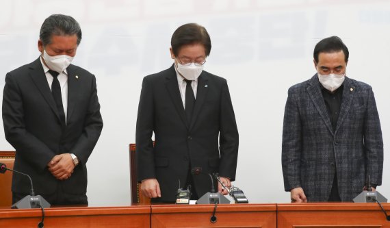 [서울=뉴시스] 최진석 기자 = 이재명 더불어민주당 대표를 비롯한 최고위원들이 30일 서울 여의도 국회에서 이태원 참사 관련 입장 표명에 앞서 이태원 참사 희생자를 애도하는 묵념을 하고 있다. 2022.10.30. myjs@newsis.com [서울=뉴시스]최진석 기자 = 더불어민주당은 30일 오전 서울 용산구 이태원 일대에서 전날 발생한 압사 사고와 관련해 긴급 최고위원회의를 열었다. 이재명 민주당 대표는 이에 대해 "놀랍고 참담하다"는 입장을 밝혔다.