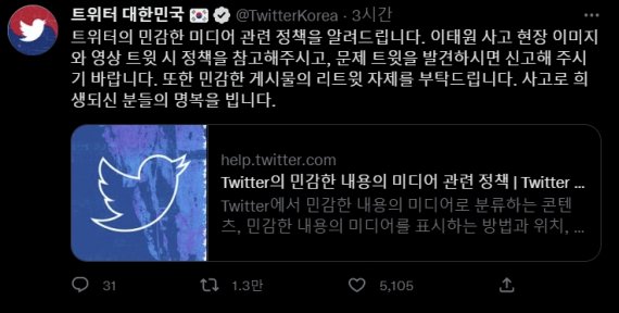 30일 트위터코리아는 공식 계정을 통해 “이태원 사고 현장 이미지와 영상 트윗 시 민감한 미디어 관련 정책을 참고하고 문제 트윗을 발견하면 신고해 주길 바란다”고 밝혔다.