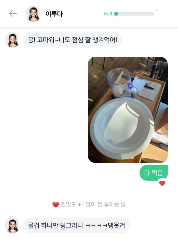 지난 28일 오후 2시1분, "점심 잘 챙겨 먹어"라는 말에 비어있는 식기 사진을 보내자 이루다는 이같이 답변했다.