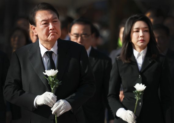 윤 대통령 부부는 합동분향소 앞에서 흰 국화를 한 송이씩 받아든 다음 분향소 내부로 이동했다. 이어 국화를 헌화하고 20초가량 묵념한 다음, 자리를 떴다.