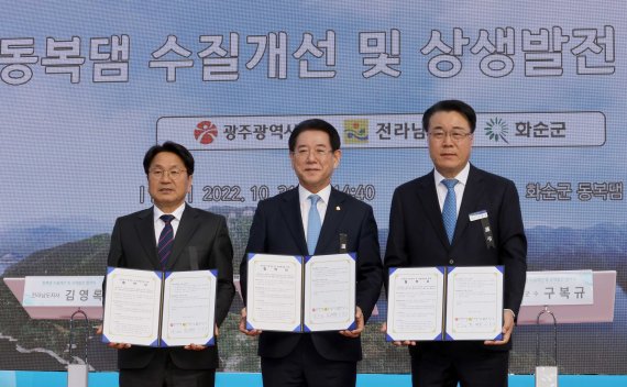 김영록 전라남도지사는 31일 화순 동복댐에서 강기정 광주시장, 구복규 화순군수와 함께 광주·전남 상생발전 현안과제 중 하나인 동복댐 상수원 공동관리 및 주변 낙후된 주민 생활환경 개선 협약을 했다.