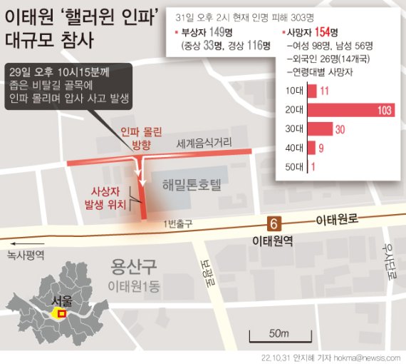 [서울=뉴시스] 조현아 기자 = 서울 이태원 해밀톤호텔이 참사가 발생한 골목길 주변으로 일부 공간을 불법 증축한 것으로 파악됐다. 이로 인해 더 비좁아진 골목길에 인파가 몰리면서 피해가 확대됐을 것이라는 지적이 나온다.