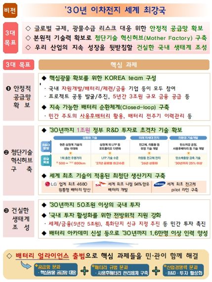 아울러 민·관은 우리나라를 배터리 첨단기술의 혁신 허브로 육성시킨다는 구상이다. 배터리 핵심기술 개발을 위해 정부 연구개발(R&D) 1조원을 포함해 2030년까지 총 20조5000억원이 투입된다. 정부 1조원, 민간 19조5000억원 규모다. 이를 통해 니켈·코발트·망간을 원료로 하는 삼원계 배터리의 성능을 고도화해 1회 충전 주행거리 800㎞를 달성할 수 있는 기술 확보를 추진한다. 차량용 전고체 전지도 2026년 상용화를 목표로 기술개발에 나선다.