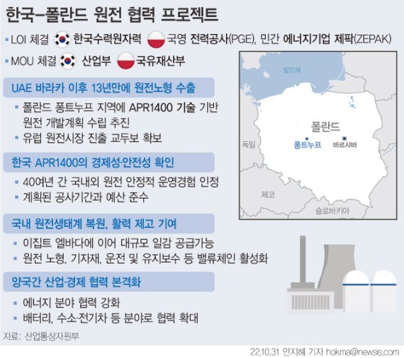 한국은 세계적으로 저비용·고효율의 원전 건설 경험이 풍부하다는 평가를 받는다. 세계원자력협회에 따르면 지난해 기준 한국의 원전 건설단가는 ㎾당 3571달러로 세계 최저 수준이었다. 폴란드 1단계 사업의 원자로나 증기발생기 등 핵심 기기를 우리가 공급할 여지도 충분한 셈이다. 이번 폴란드 민간 원전건설 수주를 계기로 현재 추진 중인 체코, 사우디아라비아를 비롯해 제3국 수출에서도 유리한 고지를 확보했다고 평가할 만하다.