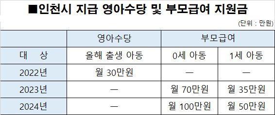 【파이낸셜뉴스 인천=한갑수 기자】 인천시는 내년부터 만 1세 미만 아동을 키우는 부모에게 매월 70만원의 부모급여를 지급한다.