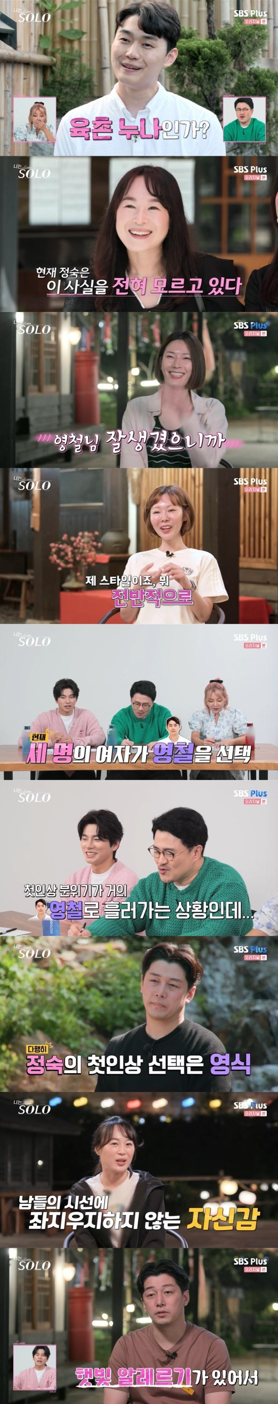 이후 여자들이 첫인상 선택에 나섰다. 순자, 영자, 옥순이 줄줄이 영철을 택했다. 영자는 "잘생겼으니까, 가장 빛났다"라고 고백했다. 옥순 역시 "제 스타일이다. 이건 수학적으로 증명하는 게 아니라 그냥 좋다, 흡족하다"라며 미소지었다.