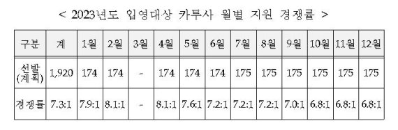 월별로는 2월과 4월이 8.1대1로 가장 높고 10∼12월은 6.8대1로 낮았다.