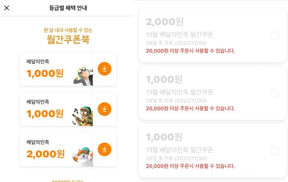 이번 월간 쿠폰 기준액 인상은 '귀한분', '더귀한분', '천생연분' 등 전 등급의 배민 VIP 회원들에게 적용됐다.