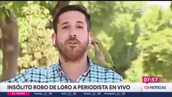 (서울=뉴스1) 소봄이 기자 = 칠레의 한 기자가 강도 사건 생방송 보도 중 앵무새 한 마리에게 무선 이어폰 한쪽을 도둑맞는 모습이 포착됐다.