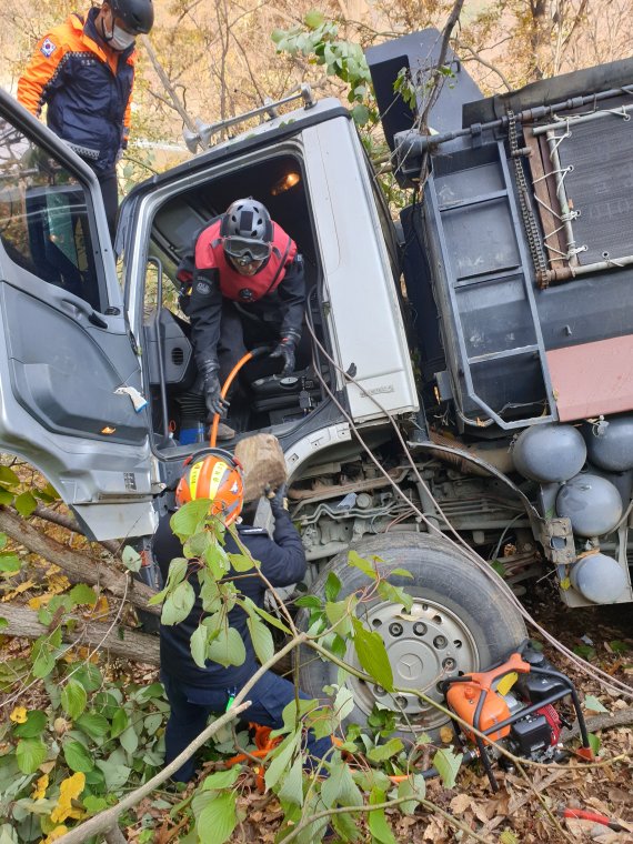 7일 오전 9시41분쯤 충북 옥천군 소정리의 한 도로에서 25톤 덤프트럭이 가드레일을 들이받은 뒤 비탈길로 추락해 소방당국이 구조작업을 벌이고 있다. (옥천소방서 제공).2022.11.7/뉴스1