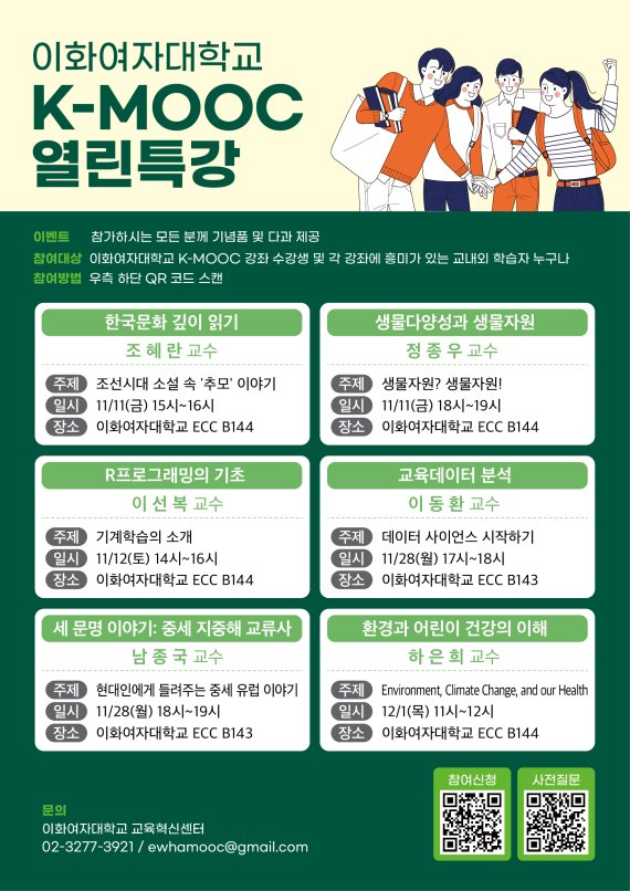 [서울=뉴시스]허서우 인턴 기자 = 이화여대 교육혁신센터(센터장 이현주)는 이화여대의 우수한 공개 온라인 콘텐츠를 알리기 위해 오는 11일부터 교내ECC 대형강의실에서 'K-MOOC 열린특강'을 개최한다고 8일 밝혔다.