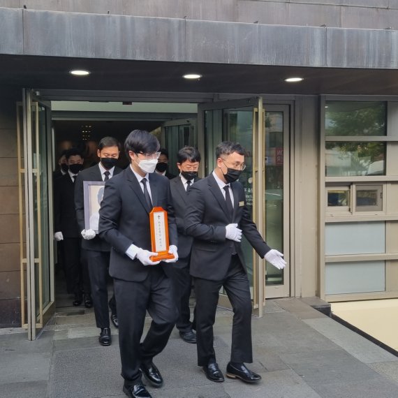 이후 친인척들이 모이자 영결식이 진행됐다. 영결식은 영정·위패 입장, 고인 약력 소개, 추모사, 헌화 등의 순으로 열렸다. 영결식이 끝난 오전 8시5분께 운구 행렬이 모습을 드러냈다.