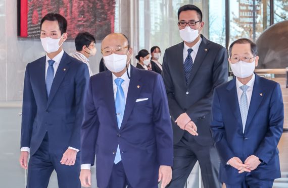 김승연 한화그룹 회장을 비롯한 임원진들이 10일 오후 서울 여의도 63빌딩에서 열린 현암(玄巖) 김종희 한화그룹 창업주 탄생 100주년 기념행사에 참석하고 있다. 사진은 왼쪽부터 김동원 한화생명 부사장, 김 회장, 김동선 한화솔루션 갤러리아 전무, 금춘수 한화 부회장. 사진=김범석 기자