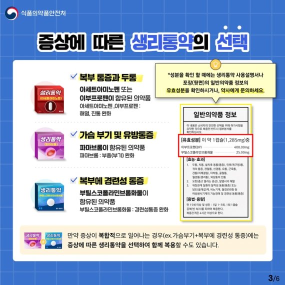 만약 증상이 복합적으로 일어날 경우 증상에 따른 생리통약을 선택해 함께 복용하는 것이 가능하다.