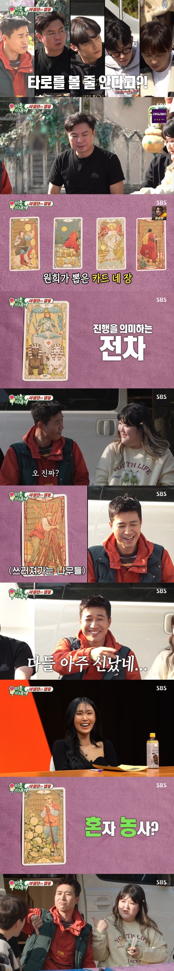 이어 임원희는 4장의 카드를 뽑았다. 임원희의 카드를 본 이국주는 "지금 솔직히 말씀드리면 나쁜 게 없다"라며 "처음 뽑은 게 달인 카드인데 계속 갈고 닦고 있다, 두 번째 카드는 컵이 있다, 컵은 마음인데, 그대로 서있다"라며 "충분히 오빠를 좋아하는 사람을 만날 수 있다"라고 했다.