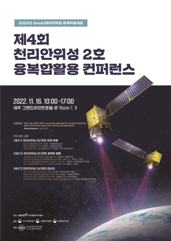 [부산=뉴시스]이동민 기자 = 한국해양과학기술원(KIOST)은 천리안위성 2호 융복합 활용 협의체 참여기관인 국가기상위성센터(NMSC), 국립환경과학원(NIER), 국립해양조사원KHOA)과 함께 16~17일 이틀간 제주 그랜드하얏트호텔에서 '제4회 천리안위성 2호(2A/2B호) 융복합 활용 컨퍼런스'를 개최한다고 밝혔다.