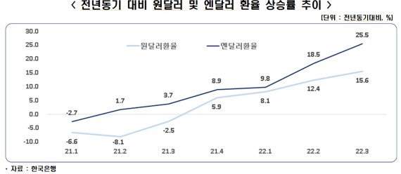 지난해 4·4분기부터 급등하기 시작한 엔달러 환율은, 올해 들어 상승세가 더욱 가팔라지고 있다. 엔달러 환율 상승률은 전년 동기대비 △2021년 4분기 8.9% △2022년 1분기 9.8% △2분기 18.5% △3분기 25.5%로 급등세를 보이며 초엔저 현상이 심화되고 있다.