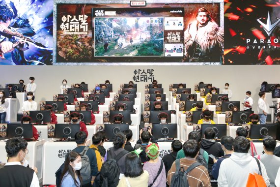 [부산=뉴시스]최은수 기자 = 국내 최대 게임 전시회 '지스타 2022' 부스에서 넷마블이 신작 다중접속역할수행게임(MMORPG) '아스달 연대기'의 대규모 전투 '개척전'을 선보이며 게이머들의 이목을 끌었다.